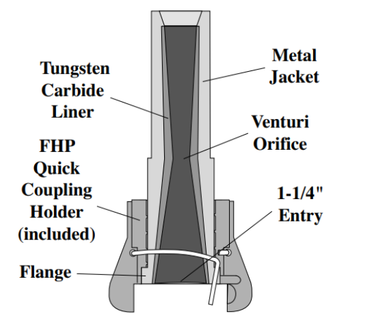 Blast nozzle with venturi shaped tungsten carbide liner and metal jacket. Thread size and entry dimensions vary with nozzle series.