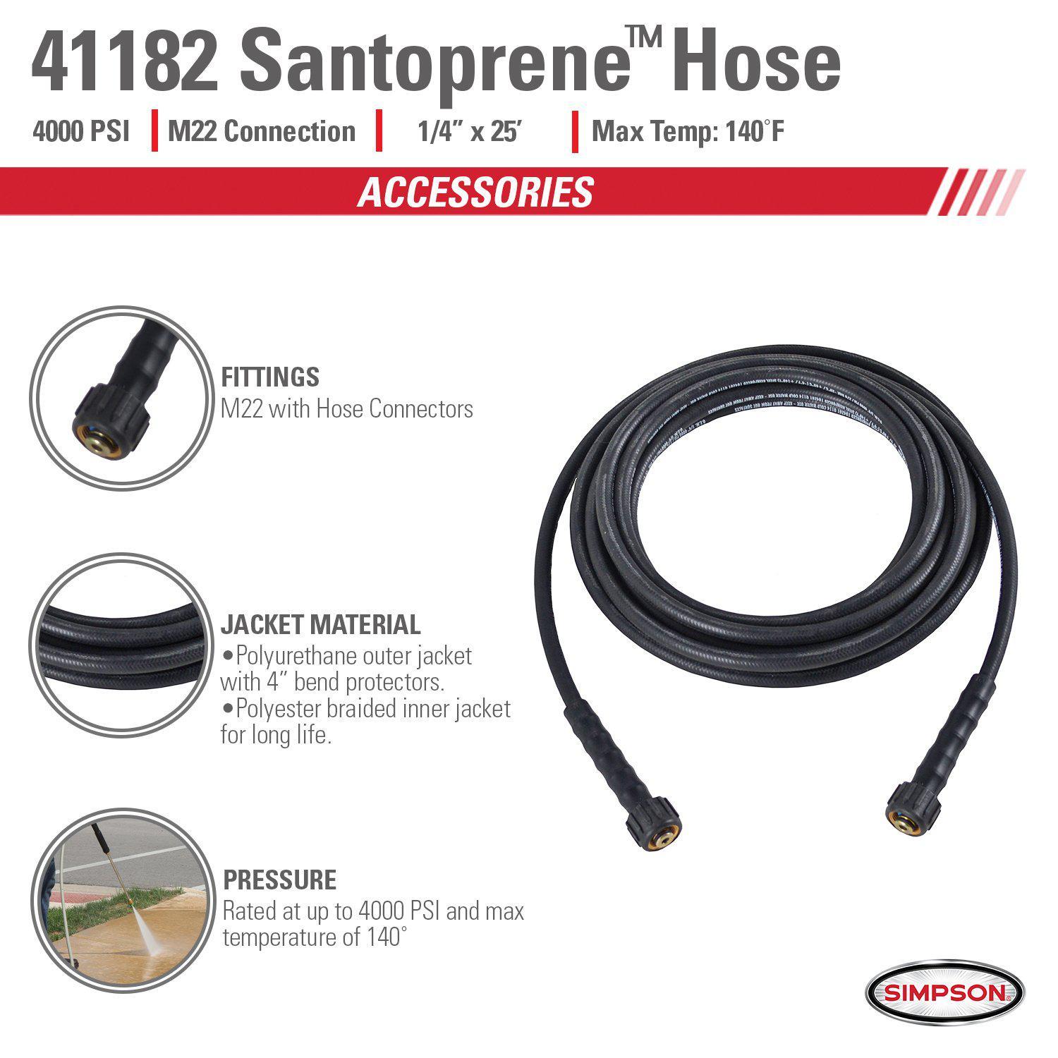 Santoprene Cold Water hose ¼” x 25’x 4000 PSI is perfect for longevity. This steel-braided, kink and abrasion resistant, durable and withstands harsh environments and temperatures as high as 140°F. The 41182 is rated up to 4000 PSI.